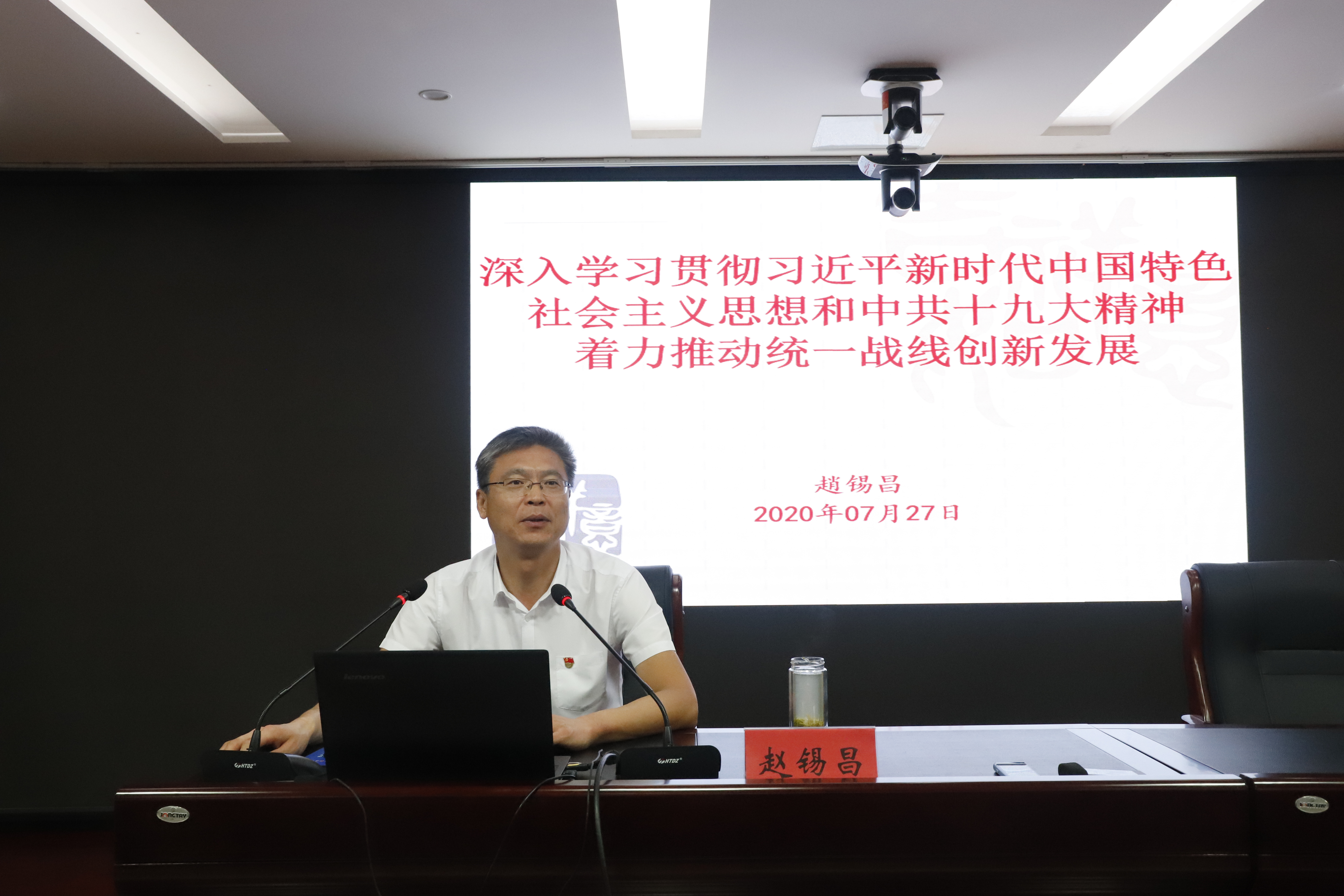 趙錫昌以《深入學(xué)習(xí)貫徹習(xí)近平新時代中國特色社會主義思想和中共十九大精神著力推動統(tǒng)一戰(zhàn)線創(chuàng)新發(fā)展》為題,圍繞新時代統(tǒng)一戰(zhàn)線的定位、新時代統(tǒng)一戰(zhàn)線的要求、新時代統(tǒng)一戰(zhàn)線的任務(wù)、新時代統(tǒng)戰(zhàn)工作的方法等四個方面,就統(tǒng)一戰(zhàn)線的性質(zhì)、主題、功能、方針、工作方法、對象范圍和中央對統(tǒng)戰(zhàn)工作的要求等重點(diǎn)內(nèi)容,為參訓(xùn)黨員干部了一堂生動的理論知識輔導(dǎo)課。