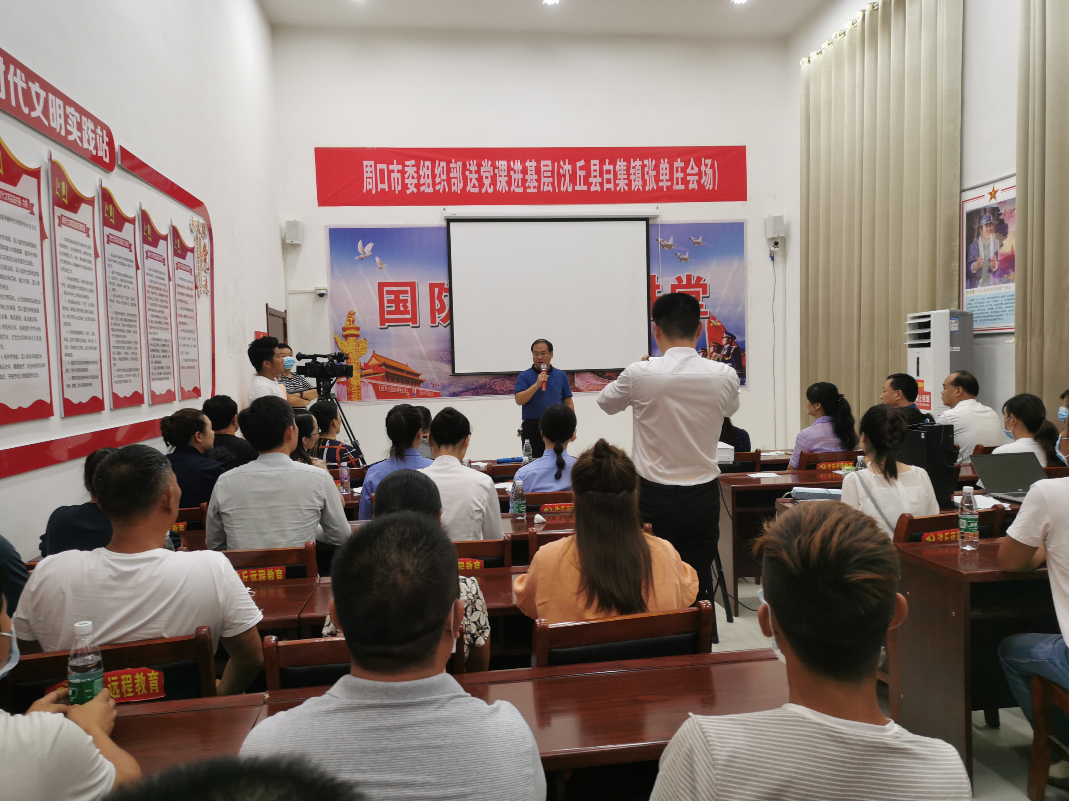 “是黨員就要勇于擔(dān)當(dāng),是黨員疫情面前就要敢于挺身而出……”8月4日下午,沈丘縣白集鎮(zhèn)張單莊村委會會議上座無虛席, 來自白集鎮(zhèn)政府、張單莊村的120多名黨員干部共同分享著一道“精神大餐”,由周口市委組織部組織的“送黨課下基層”活動正在上演。
