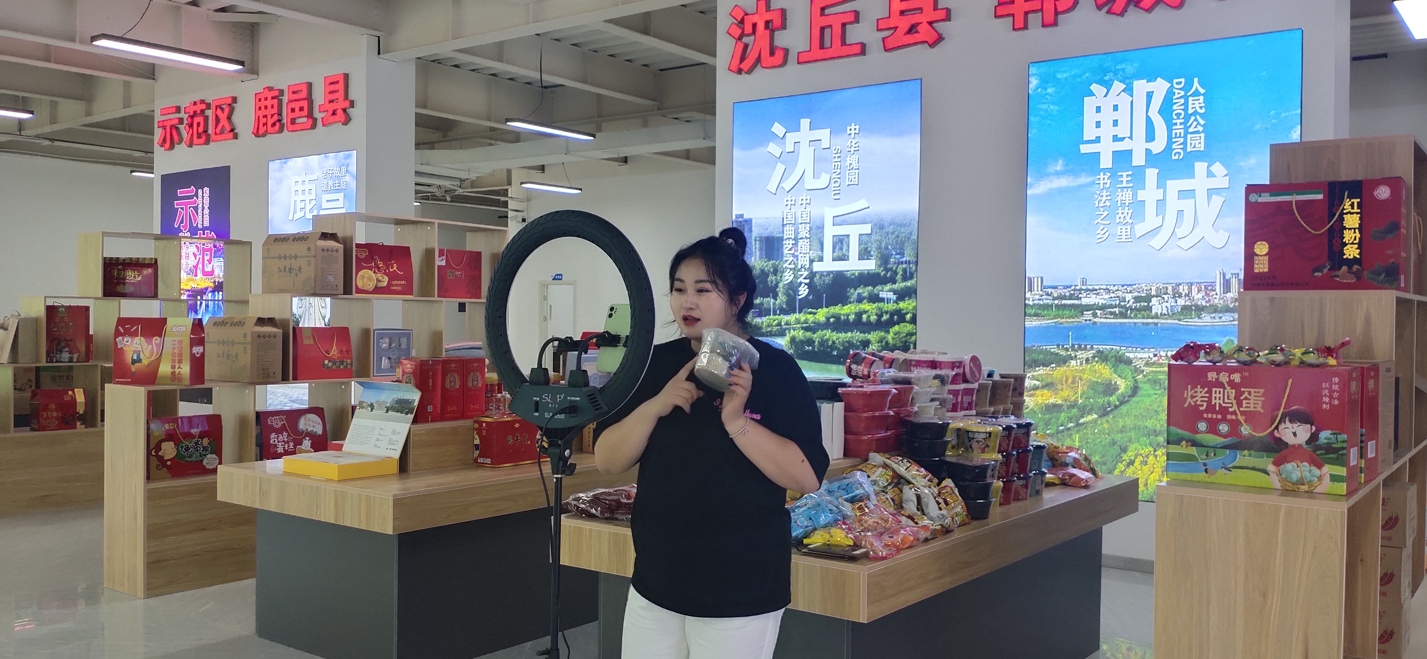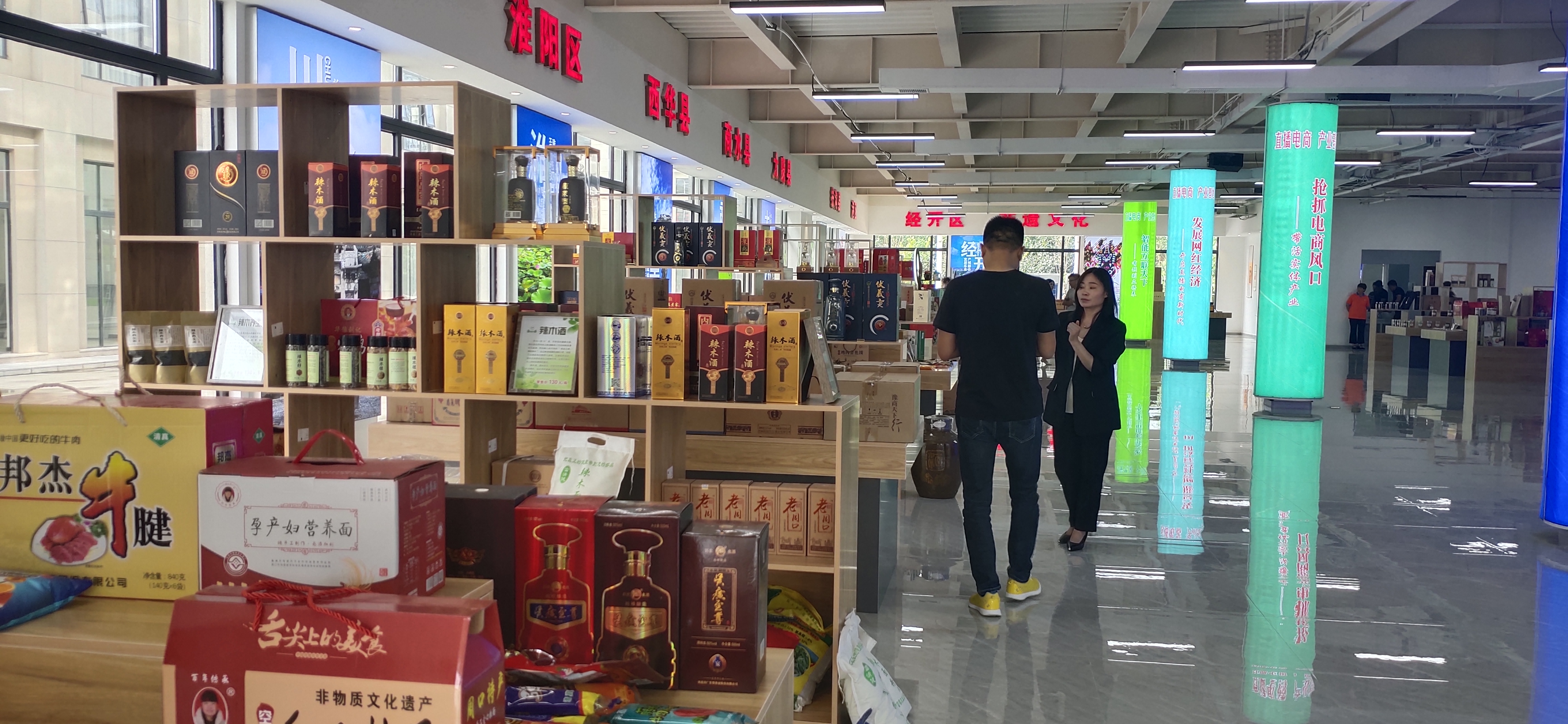 中心展廳面積達1000多平方米,按照不同縣(市、區(qū))劃分為十幾個區(qū)域,集中展示邦杰牛肉、伏羲貢酒、鄧城豬蹄、汝陽劉毛筆、三川豫龍復合肥等周口產品。這些產品都是來自各縣(市、區(qū))等地農工副土特產品以及非遺產品?!拔覀儗⑼ㄟ^抖音、快手等視頻平臺,把這些產品銷往全國各地?!?該基地負責人、周口東方會展商會會長于海崗說。