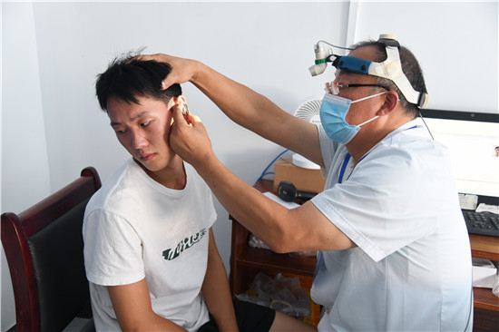 8月11日,在商水縣中醫(yī)院征兵體檢站,應(yīng)征青年在檢測聽力。