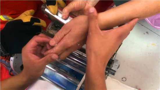 到達現(xiàn)場后,救援人員發(fā)現(xiàn)后廚一名女店員的右手小拇指被緊緊夾在壓面機里,由于疼痛難忍,女子情緒非常不穩(wěn)。由于救援空間狹小,為了確保安全,救援人員用螺絲刀、扳手等工具對機器外部進行拆解。拆解后,救援人員利用破拆工具組對壓面機滾軸進行擴張,把夾住被困人手掌的滾軸分離?!芭椤钡囊宦?,壓面機的滾動軸松開了一條縫,救援人員成功把女店員的手從擴張后的壓面機滾軸縫隙中抽出來,并迅速移交給現(xiàn)場醫(yī)務人員。