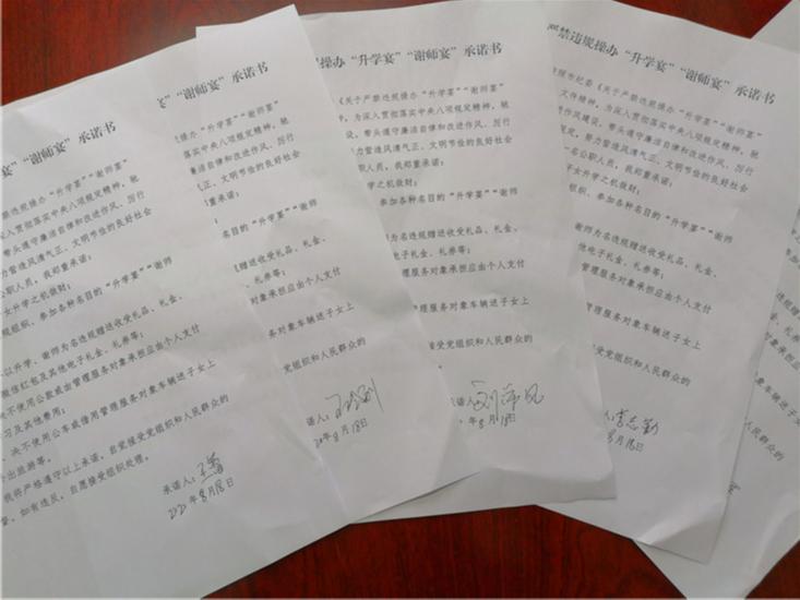 傳導(dǎo)壓力,壓實責(zé)任。壓實全面從嚴治黨主體責(zé)任,認真統(tǒng)計匯總有子女參加中考、高考的干部職工情況,逐一簽訂《嚴禁操辦“升學(xué)宴”“謝師宴”承諾書》,逐級開展預(yù)防提醒談話,精準(zhǔn)傳導(dǎo)壓力和責(zé)任,教育引導(dǎo)干部職工自覺抵制操辦、參與“升學(xué)宴”、“謝師宴”。