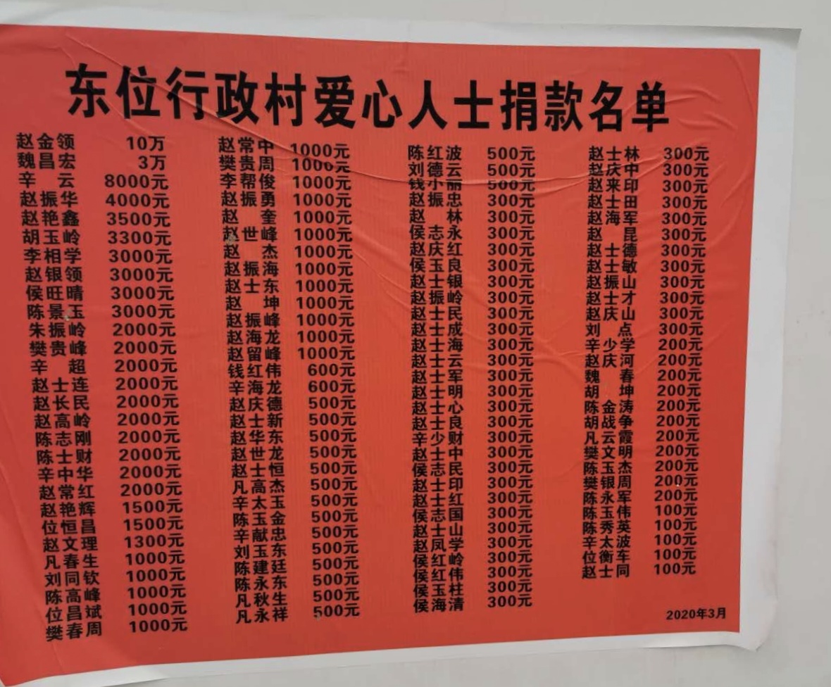 樊玉周向記者展示了兩份成績單:第一份是大家捐款明細。第二份便是鄉(xiāng)賢響應黨委政府號召參與美麗東位建設,為村莊帶來的新變化:實施坑塘改造1處面積300平方,道路硬化810米,硬化胡同5條700米并完善排水管道,綠化面積2600平方米,新建文化廣場3座,實施高標準農(nóng)田水利建設,溝渠治理2800米,新挖機井45口,旱廁改造率80%以上,自來水、寬帶網(wǎng)絡實現(xiàn)全覆蓋,電網(wǎng)進行了全面改造,9個自然村路燈全覆蓋,趙莊自然村監(jiān)控全覆蓋……