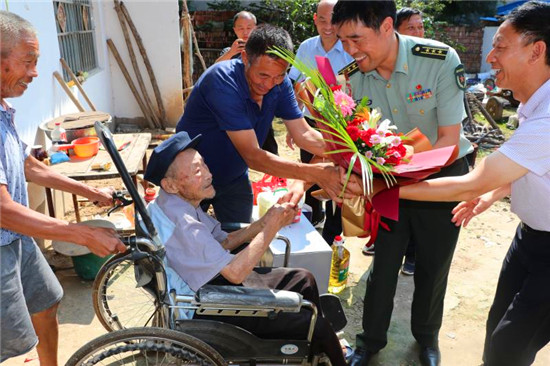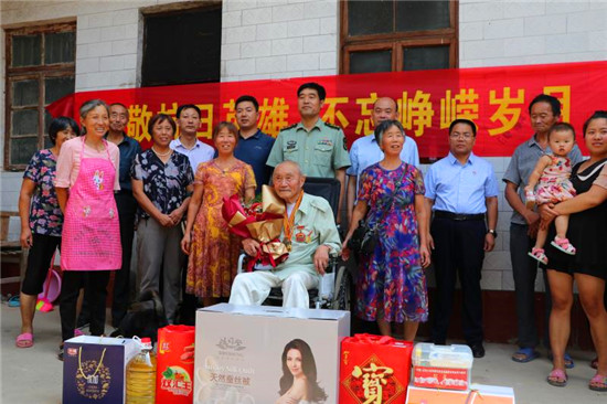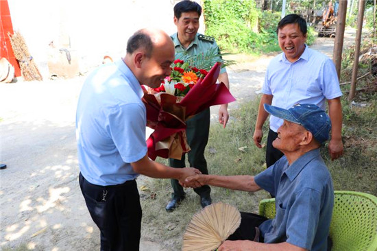 于永前一行來(lái)到楊廟鄉(xiāng)大祁行政村時(shí)已近中午,正趕上97歲抗日老戰(zhàn)士吳之太過生日。吳之太老少一家人歡聚一堂,其樂融融??吹轿繂柦M的到來(lái),老人喜極而泣。吳之太老人擦著眼淚說(shuō):這些年沒少給黨和政府找麻煩,尤其是縣退役軍人事務(wù)局成立后,幫助他解決了好多困難和問題,并定期來(lái)看望他,今天又見到大家,真不知道該說(shuō)什么好。潘布道代表退役軍人事務(wù)局向老人祝賀生日并告訴老人說(shuō):抗戰(zhàn)老戰(zhàn)士是民族的英雄、國(guó)家的財(cái)富,為黨的革命和建設(shè)作出了不可磨滅的貢獻(xiàn)。今后,將一如既往地關(guān)心和幫助抗戰(zhàn)老戰(zhàn)士,盡力幫助解決生活中的實(shí)際問題,在全社會(huì)形成尊重抗戰(zhàn)老戰(zhàn)士、尊崇抗戰(zhàn)老戰(zhàn)士、關(guān)愛抗戰(zhàn)老戰(zhàn)士的良好氛圍。