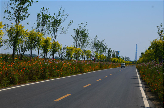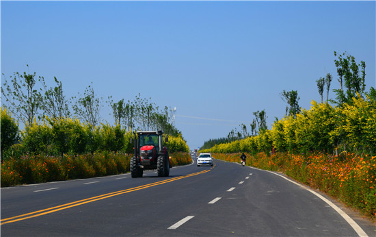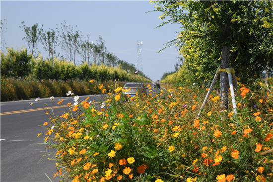 9月2日,富裕起來的農(nóng)民駕車行駛在商水縣高標(biāo)準(zhǔn)農(nóng)田示范區(qū)內(nèi)兩側(cè)開滿鮮花的田間道路上。秋天到來,5萬畝示范區(qū)內(nèi)縱橫交叉的近20公里田間道路兩側(cè)混種的格?;ā⒉ㄋ咕?、百日草等在燦爛的陽光下爭奇斗艷,與長勢喜人、豐收在望的秋作物相映成輝,引來許多市民前來觀賞。記者付永奇攝
