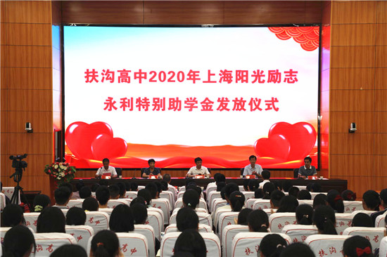 9月3日,上海陽(yáng)光勵(lì)志獎(jiǎng)學(xué)金發(fā)放儀式在扶溝縣高中舉行。副縣長(zhǎng)史凱歌,縣教體局局長(zhǎng)翟連生,扶溝高中全體領(lǐng)導(dǎo)班子、教師代表、獲獎(jiǎng)學(xué)生和部分學(xué)生代表共計(jì)200余人參加了發(fā)放儀式。