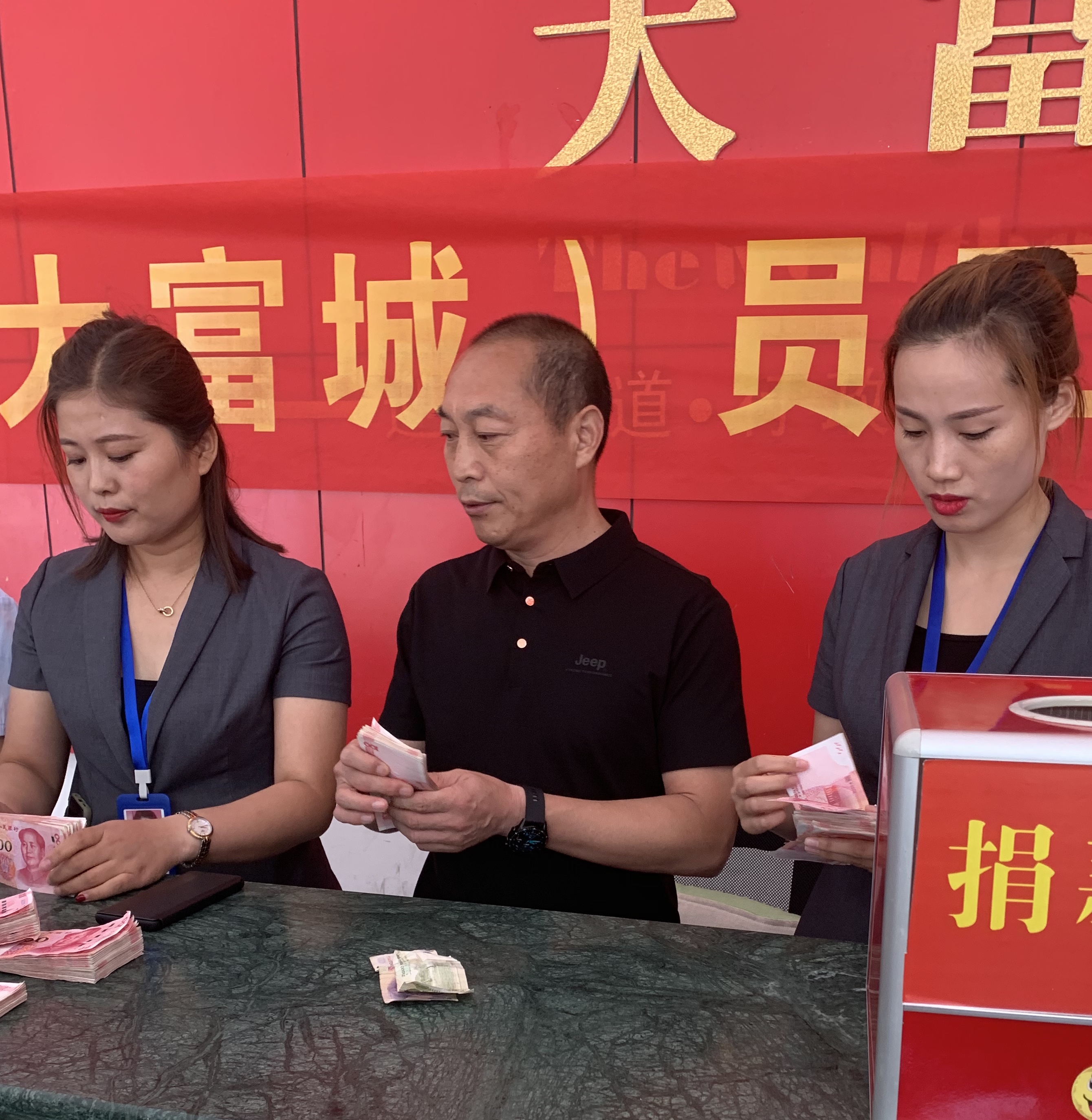 9月4日一大早,方凱帶領41名員工在西華縣大富城設立的捐款處為朱亞萍家進行捐款。