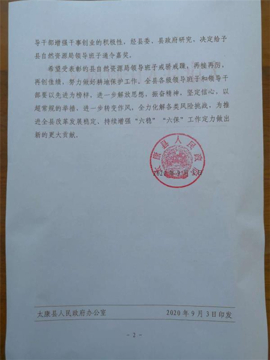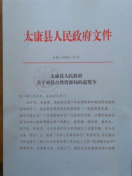 9月3日,太政﹝2020﹞20號文件發(fā)布太康縣人民政府關(guān)于對縣自然資源局的嘉獎令。