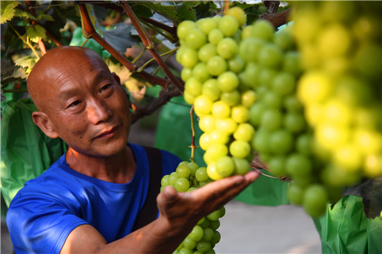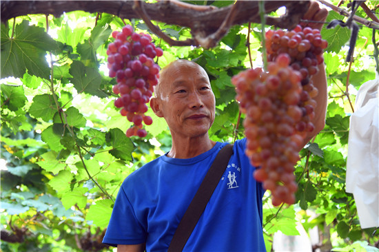 9月10日,商水縣農(nóng)業(yè)專家劉啟山在綠苑葡萄園內(nèi)察看葡萄生長情況。