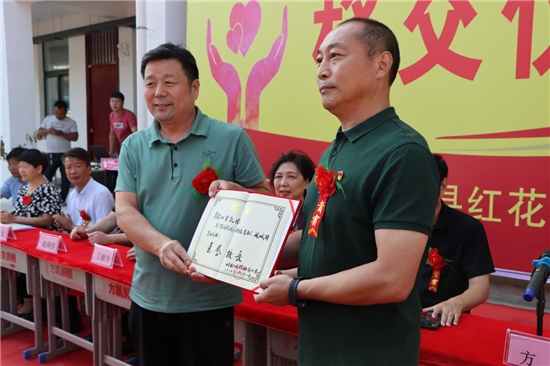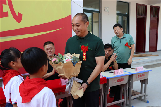 在熱烈祥和的氣氛中,方凱向杜崗小學(xué)校長交付新建教學(xué)樓鑰匙。一把“金鑰匙”,蘊(yùn)含著一位人大代表、慈善家對莘莘學(xué)子的濃濃真情。紅花鎮(zhèn)中心小學(xué)校長楊光華向方凱頒發(fā)杜崗小學(xué)終身名譽(yù)校長證書。一份終身名譽(yù)校長證書,承載著一位人大代表、慈善家對教育事業(yè)的厚重責(zé)任。學(xué)生代表走上前臺,向方凱叔叔致意、獻(xiàn)花,把儀式推向高潮。