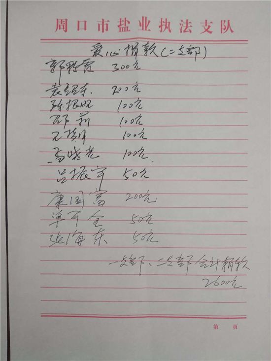 支隊(duì)黨委得知這一情況后,高度重視,隨即向全體黨員發(fā)起了《捐款獻(xiàn)愛心倡議書》,號(hào)召全體黨員進(jìn)行捐款,奉獻(xiàn)一份愛心。第一、第二黨支部積極行動(dòng),大家踴躍捐款。截止到11日上午,共捐款2600元。