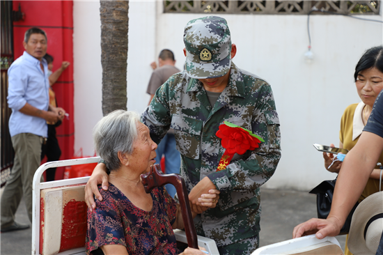 當(dāng)日,新兵們身著嶄新軍裝,胸前佩戴大紅花,軍姿筆挺地站列家長兩側(cè),聆聽政委李峰的講話:“你們從體檢、政考、役前教育訓(xùn)練、封閉隔離等環(huán)節(jié)中脫穎而出。在這即將奔赴軍營之際,對你們和家長表示祝賀,希望你們要不忘初心,堅定從軍報國的信念,把滿腔的熱情轉(zhuǎn)化為報國之志;要把握機(jī)會,積極主動參加訓(xùn)練,爭當(dāng)優(yōu)秀士兵、班長骨干,在軍營建功立業(yè);要心系故里,牢記家鄉(xiāng)親人殷切期盼,為家鄉(xiāng)爭光添彩?!?/p>