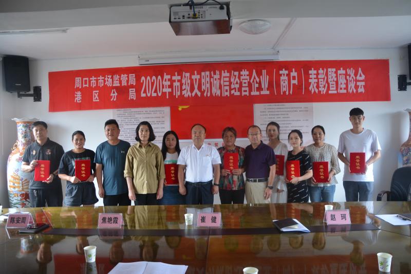 為進(jìn)一步強(qiáng)化市場(chǎng)主體文明經(jīng)營(yíng)、誠(chéng)信經(jīng)營(yíng)、合法經(jīng)營(yíng)的理念,助力全國(guó)文明城市提名城市創(chuàng)建工作,9月16日下午,周口市市場(chǎng)監(jiān)管局港區(qū)分局召開(kāi)表彰2019年度全市“文明誠(chéng)信企業(yè)、文明誠(chéng)信商戶”暨座談會(huì),對(duì)轄區(qū)2家市級(jí)“文明誠(chéng)信企業(yè)”和8家市級(jí)“文明誠(chéng)信商戶”進(jìn)行表彰。
