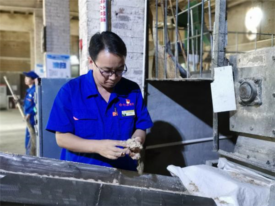 9月17日上午,大河網(wǎng)記者在河南仰韶酒業(yè)有限公司的制曲車間看到,曲磚生產(chǎn)線正在緊張生產(chǎn),張振科抓起傳送帶上的原料進行擠壓,查看原料的水分度和粉碎度。和生產(chǎn)線的工人交流后,張振科又和徒弟來到曲庫,分別拿起半塊曲磚,放到鼻子下,深深吸氣,嗅聞曲磚的曲香。