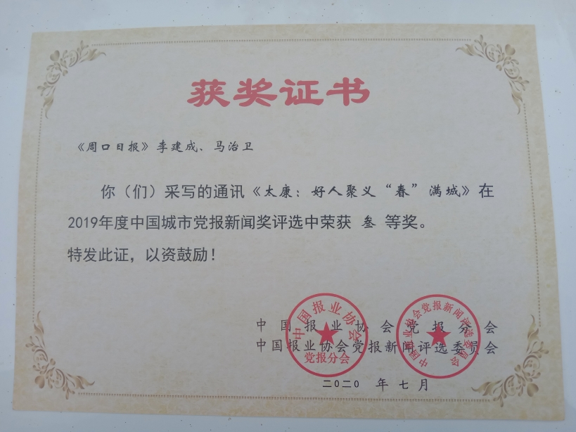 繼太康“五養(yǎng)模式”榮獲3項(xiàng)省級(jí)以上新聞大獎(jiǎng)之后,日前從周口報(bào)業(yè)集團(tuán)新聞研究室再次傳來(lái)好消息,《周口日?qǐng)?bào)》頭版刊發(fā)的太康“好人之城”通訊《太康:好人聚義“春”滿城》(作者:李建成 馬治衛(wèi))一文,榮獲中國(guó)城市黨報(bào)新聞獎(jiǎng)三等獎(jiǎng)。
