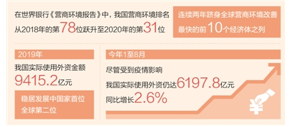 “十三五”期間,我國持續(xù)深化體制機(jī)制改革,全方位擴(kuò)大對(duì)外開放,降低準(zhǔn)入門檻,提升服務(wù)質(zhì)量。在世界銀行《營商環(huán)境報(bào)告》中,我國營商環(huán)境排名從2018年的第78位躍升至2020年的第31位,連續(xù)兩年躋身全球營商環(huán)境改善最快的前10個(gè)經(jīng)濟(jì)體之列。