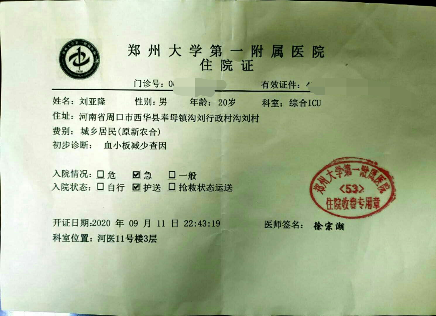 (鄭大一附院住院證)