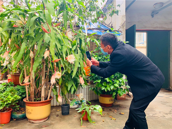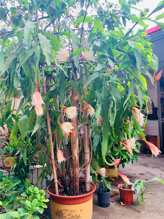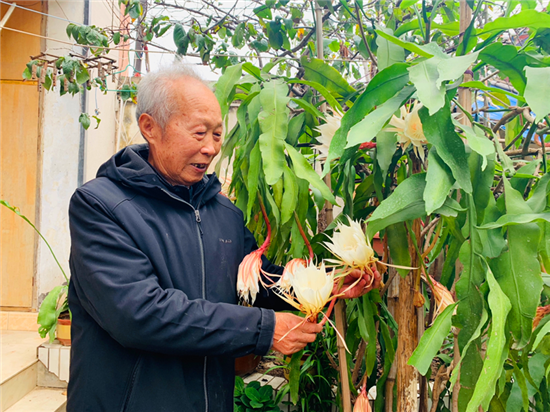 在周口市中心城區(qū)的一個(gè)家屬院里,記者見到了88歲的苗天才和他養(yǎng)的曇花,“一株21年樹齡的曇花開了43朵,另外兩株5年樹齡的曇花加起來開了13朵,這3株曇花一共開了56朵。”苗天才說,早上四五點(diǎn)的時(shí)候曇花就慢慢地開放了,到現(xiàn)在五六個(gè)小時(shí)過去了曇花還保持著開放狀態(tài)。