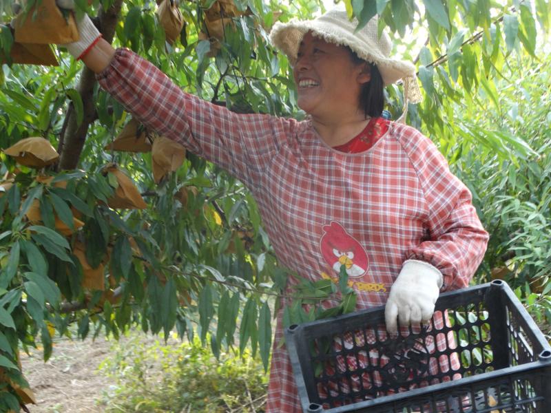 “王老板,桃子豐收了,眼下銷(xiāo)售這么好,是不是該給俺發(fā)獎(jiǎng)金了?”說(shuō)話間,正在采摘桃子的“鐵桿工人”楊秀榮一旁打趣道。