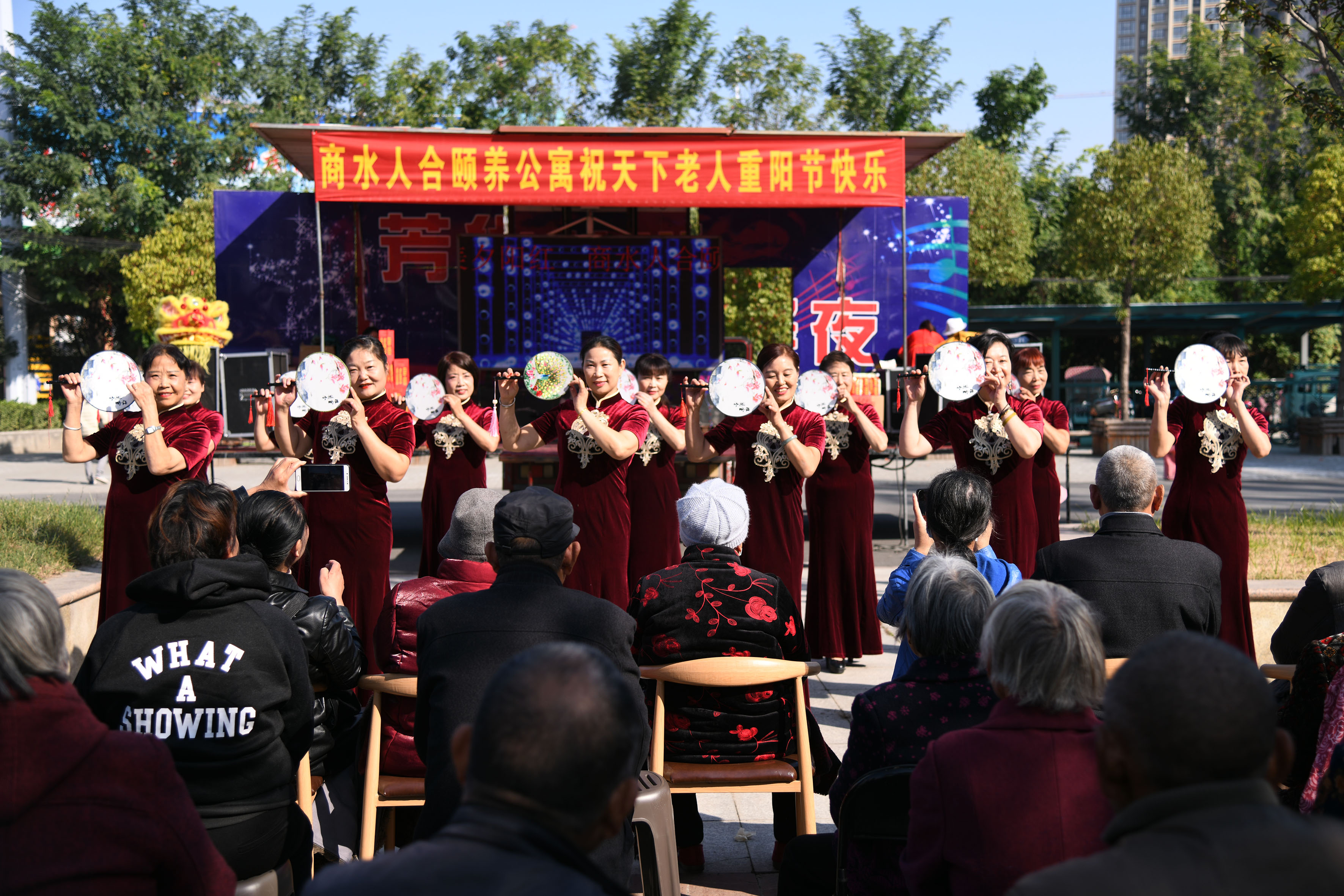 公寓外搭起戲臺,商水人合頤養(yǎng)公寓在重陽節(jié)里給喜愛聽?wèi)虻睦先藴蕚淞艘慌_大戲。老人吃過早點,準備停當(dāng)之際,公寓外的大戲鳴鑼響起。老人們在服務(wù)人員的侍候下,來到院內(nèi),坐下來聽?wèi)?。讓老人們興奮的是聽?wèi)虻挠^眾里有很多是不認識的老姐妹,經(jīng)打聽才知道她們是附近社區(qū)的老姐妹兒。她們重陽節(jié)里來人合公寓不僅僅是聽?wèi)?,還聽說公寓里條件好、服務(wù)好、娛樂多,是老年人值得托付養(yǎng)老的好地方,很多人結(jié)伴前來探個究竟。