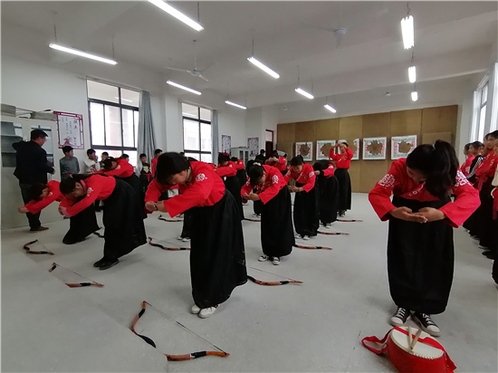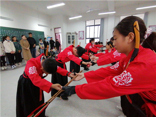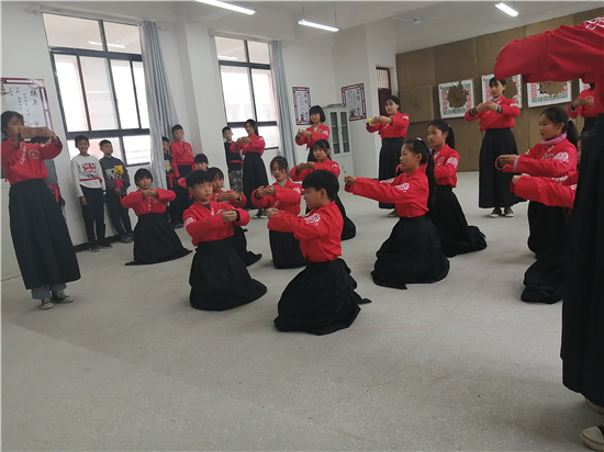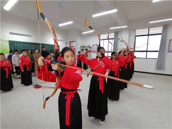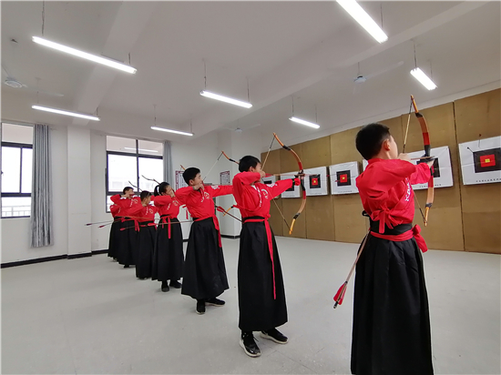 在皮營學(xué)校活動室,學(xué)校舞蹈社團(tuán)的小朋友展示了傳統(tǒng)儀式《鹿鳴》,深情的演繹,展示了他們對國學(xué)經(jīng)典的理解。禮射是禮樂文明重要組成部分,習(xí)射先習(xí)禮,射以觀德。習(xí)射可以強(qiáng)健體魄,其中還蘊(yùn)含了眾多古人先賢的智慧。皮營學(xué)校禮射興趣班的小朋友進(jìn)行禮射表演,隨著挾矢,正筈,審固,舉弓,引彀,發(fā)矢,斂弓,執(zhí)弦等一系列指令,拈弓搭弦展示禮射八法。在這里,學(xué)生們通過不同方式的展示,詮釋自己對“禮”“樂”的理解和認(rèn)知。