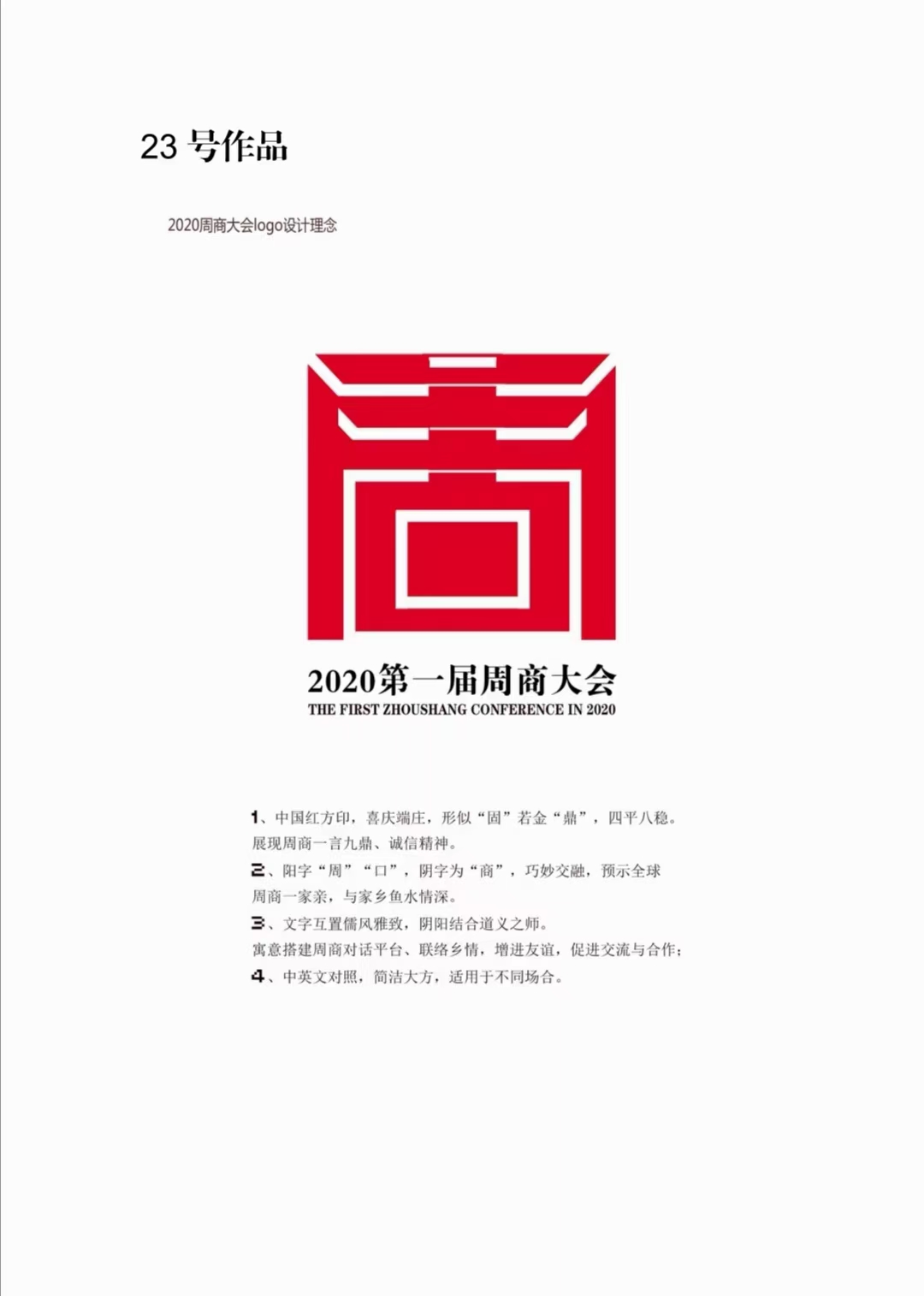 23號(hào)作品設(shè)計(jì)者沈湛向記者介紹了獲獎(jiǎng)作品的設(shè)計(jì)理念。作品采用中國紅,喜慶端莊,智圓行方,形似“固”若金“鼎”,四平八穩(wěn),展現(xiàn)了周商的志存高遠(yuǎn)、一言九鼎和誠信經(jīng)營。同時(shí),陽字“周”“口”,陰字為“商”,巧妙交融,預(yù)示全球周商一家親,周商和家鄉(xiāng)魚水情深。再者,文字互置儒風(fēng)雅致,陰陽結(jié)合道義之師,寓意搭建周商對(duì)話平臺(tái),聯(lián)絡(luò)鄉(xiāng)情、增進(jìn)友誼,促進(jìn)交流與合作。最后,中英文對(duì)照,簡潔大方,適用于不同場(chǎng)合。