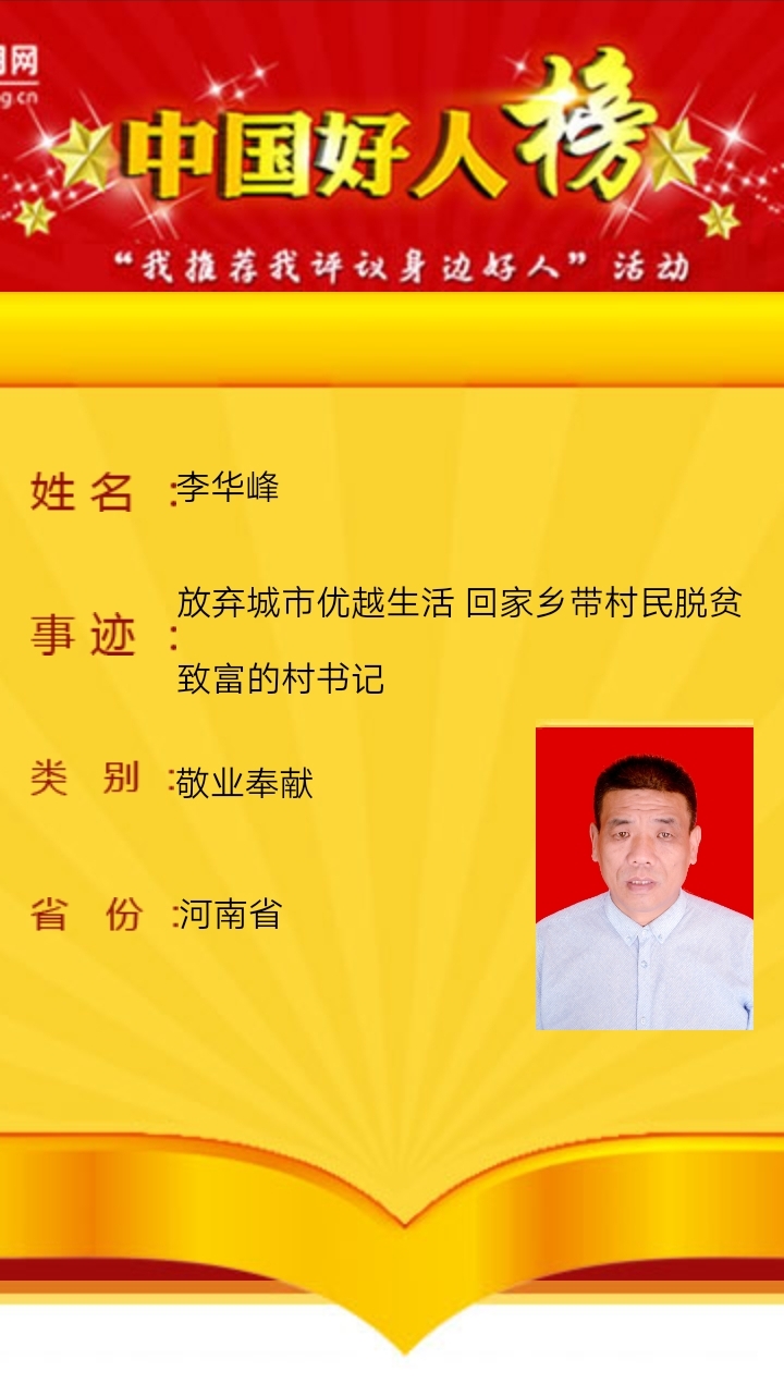 昨日,記者從市文明辦獲悉,今年46歲現(xiàn)任太康縣轉樓鎮(zhèn)李報真行政村黨支部書記的李華峰,放棄城市優(yōu)越生活,回鄉(xiāng)帶領村民致富,榮登2020年10月份“敬業(yè)奉獻”類“中國好人榜”。至此太康縣中國好人達到67人。