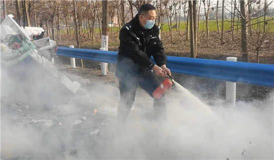 當(dāng)日下午4點左右,太康縣交警大隊二中隊指導(dǎo)員南應(yīng)開及輔警郭旗全、魯?shù)?、尹晨豪正在趙堂村附近巡邏時,猛然看到前方一輛電動三輪車上有煙氣冒出,巡邏民警加速趕到。原來是一名老漢的一輛拉著廢舊紙箱的電動三輪車著了火,一車廢紙和塑料瓶散落一地正在燃燒,火越燒越旺,只見老漢正在手忙腳亂地滅火。這輛三輪車上拉的全是廢塑料、硬紙殼等易燃物,而且當(dāng)時正刮著風(fēng),如果不及時滅火任由火勢蔓延,后果將不堪設(shè)想??吹酱饲闆r后,南應(yīng)開迅速從警車上拿出滅火器秒變“消防員”,對著起火的物品進行滅火操作,同時安排輔警對過往行人和車輛進行疏導(dǎo)。由于發(fā)現(xiàn)和撲救及時,在民警的緊急救援下,火源很快被眾人合力撲滅。對太康交警面對火情臨危不亂、果斷處置、幫助群眾的行為,老漢車主和過往群眾紛紛點贊。②6