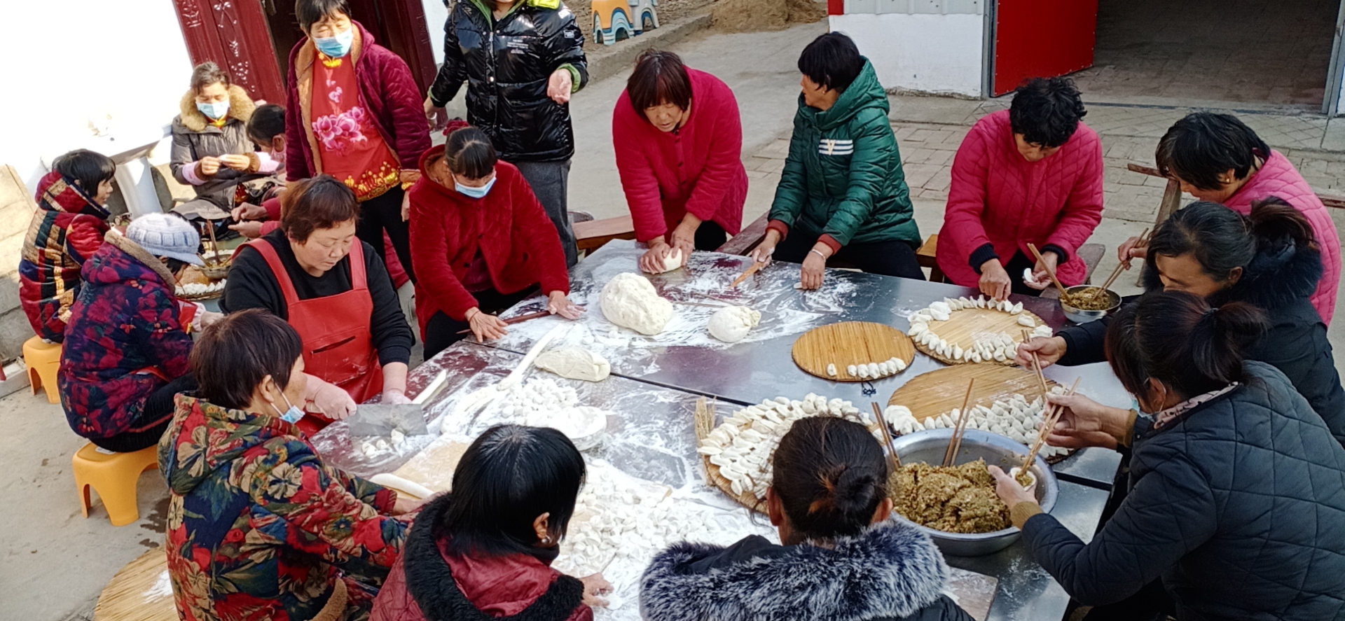 鄉(xiāng)村大食堂院子里,大家有說有笑,圍在數(shù)平方米的巨大案板前,個個拿出了看家本領,分工協(xié)作,揉面、搟皮、包餃子,個個動作嫻熟,包起餃子來麻利干練,不知不覺間,面前的盤子里就擺滿了餃子。