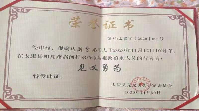 渦河哽咽,落葉飄曳。12月3日上午,太康縣退役軍人劉學(xué)思追悼會(huì)莊重舉行。11月12日,根據(jù)工作安排,太康縣對(duì)陽夏路渦河排水提泵站進(jìn)行檢查維護(hù)作業(yè)。10時(shí)許,一名工人下井作業(yè)意外墜落井下,另外2名工人緊急施救被困,情況萬分危急,被困人員隨時(shí)都有生命危險(xiǎn),現(xiàn)場(chǎng)負(fù)責(zé)人及時(shí)撥打救援電話。得知此事的市政工程隊(duì)職工劉學(xué)思迅速趕到現(xiàn)場(chǎng),強(qiáng)烈要求下井救人不幸遇難。太康縣見義勇為評(píng)定委員會(huì)評(píng)定劉學(xué)思的救人行為是“見義勇為”。