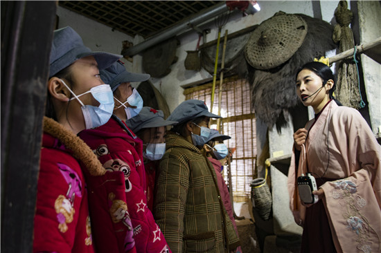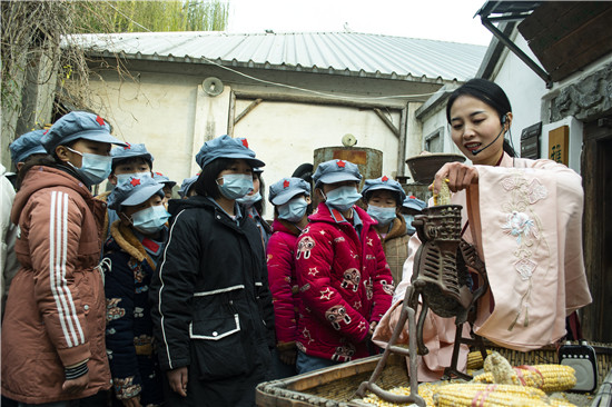 孩子們了解過去農(nóng)家玉米脫粒場景