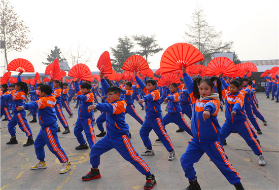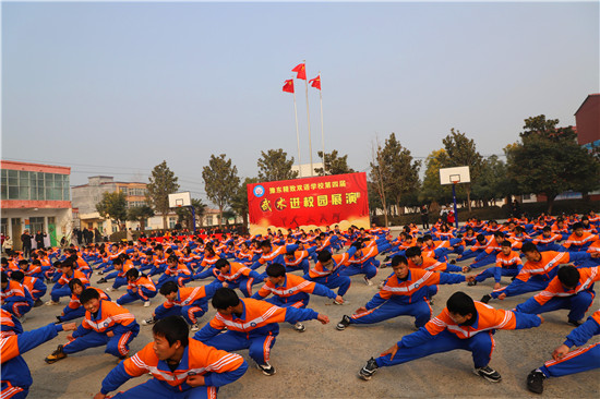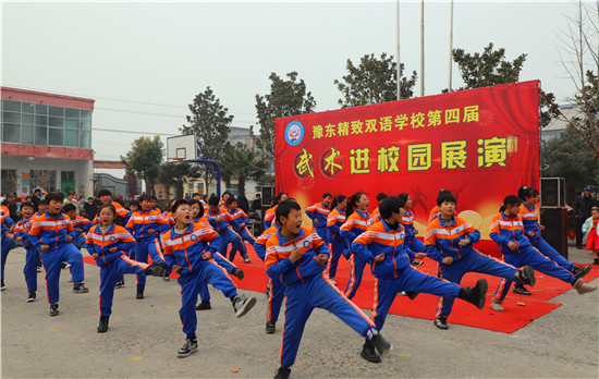 “嘿!哈!”“嘿!哈!”……12月28日,一聲聲鏗鏘有力而又充滿童稚的喊聲,在商水縣譚莊鎮(zhèn)豫東精致雙語學(xué)校上空回蕩。由該校800多名學(xué)生參加的第四屆武術(shù)進(jìn)校園展演活動(dòng)正在舉行。