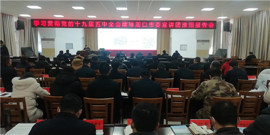12月30日下午,學(xué)習(xí)貫徹黨的十九屆五中全會(huì)精神市委宣講團(tuán)淮陽報(bào)告會(huì)在淮陽區(qū)委會(huì)議室舉行。市委宣講團(tuán)成員、市科技局黨組書記、局長韋剛向與會(huì)廣大黨員干部深刻闡釋黨的十九屆五中全會(huì)精神,推動(dòng)全會(huì)精神深入人心,凝聚奮進(jìn)力量。