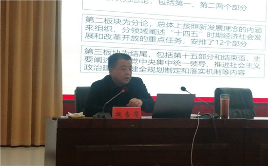 韋剛從深刻理解我國進(jìn)入新發(fā)展階段的重大意義、有利條件、重要特征和重要戰(zhàn)略機(jī)遇期,準(zhǔn)確把握2035年遠(yuǎn)景目標(biāo)和“十四五”時(shí)期我國發(fā)展的指導(dǎo)方針、主要目標(biāo)、重點(diǎn)任務(wù),牢牢把握構(gòu)建新發(fā)展格局的戰(zhàn)略構(gòu)想和重要著力點(diǎn),堅(jiān)持黨的全面領(lǐng)導(dǎo)等方面,生動(dòng)翔實(shí)地解讀了十九屆五中全會(huì)精神,既有思想深度又有理論高度,為與會(huì)人員深入、系統(tǒng)、精準(zhǔn)把握五中全會(huì)精神,進(jìn)一步結(jié)合實(shí)際抓好全會(huì)精神貫徹落實(shí)、高質(zhì)量推進(jìn)各項(xiàng)工作提供了有益參考。