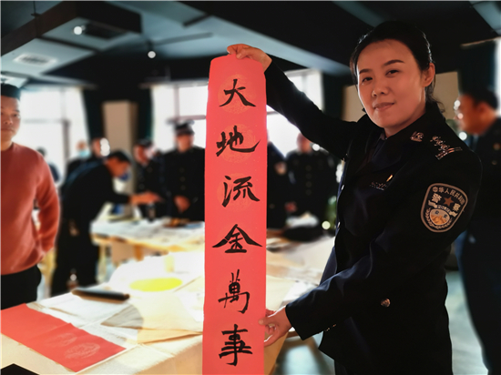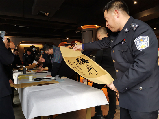 活動(dòng)現(xiàn)場(chǎng),氣氛熱烈,書(shū)法家們現(xiàn)場(chǎng)揮毫潑墨、筆走龍蛇,帶著喜迎牛年的美好祝愿。民警、輔警爭(zhēng)相圍觀,觀看、揣摩書(shū)法家們蒼勁有力的書(shū)法作品,房間內(nèi)洋溢著濃郁的節(jié)日氣息。