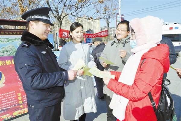 今年1月10日是第35個(gè)“110宣傳日”,也是首個(gè)“中國(guó)人民警察節(jié)”。我市公安系統(tǒng)圍繞“一心為民110,砥礪奮進(jìn)新征程”這一主題,開展了大型宣傳活動(dòng)。圖為扶溝公安民警向群眾發(fā)放宣傳資料。