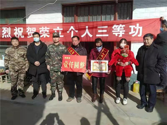 為廣泛宣傳立功現(xiàn)役軍人先進(jìn)事跡,大力營(yíng)造“軍愛(ài)民,民擁軍,軍民一家親”的良好社會(huì)風(fēng)尚,1月12日,西華縣武裝部政委涂友佳、縣退役軍人事務(wù)局局長(zhǎng)龔坤敬等人一行,在東夏亭鎮(zhèn)鎮(zhèn)長(zhǎng)龐友誼、鎮(zhèn)武裝部長(zhǎng)王中原、退役軍人服務(wù)站站長(zhǎng)李俊奎等人的陪同下來(lái)看望慰問(wèn)在部隊(duì)榮立三等功的軍人袁聯(lián)盟、王俊亞家屬,并為他們分別送上喜報(bào)、慰問(wèn)品及慰問(wèn)金1000元。