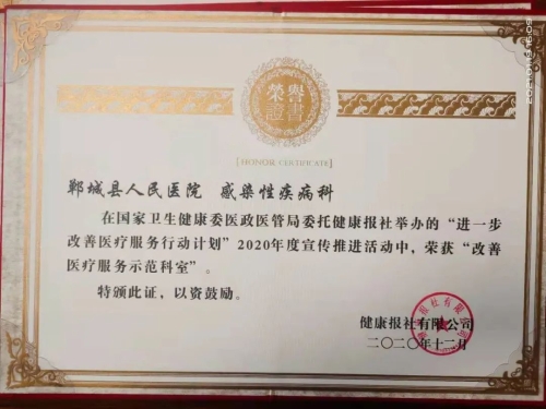 日前,鄲城縣人民醫(yī)院在國(guó)家衛(wèi)健委醫(yī)政醫(yī)管局發(fā)起的“進(jìn)一步改善醫(yī)療服務(wù)行動(dòng)計(jì)劃”活動(dòng)中再獲殊榮,被授予“改善醫(yī)療服務(wù)示范醫(yī)院”榮譽(yù)稱號(hào),醫(yī)院重癥醫(yī)學(xué)科、感染性疾病科榮獲“改善醫(yī)療服務(wù)先進(jìn)科室”,集團(tuán)成員單位虎崗鄉(xiāng)衛(wèi)生院榮獲“改善醫(yī)療服務(wù)示范醫(yī)院”。這也是我院連續(xù)第六年被國(guó)家衛(wèi)健委醫(yī)政醫(yī)管局表彰。