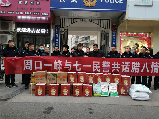 “臘八,臘八,凍掉下巴?!迸D八前后是一年里最為寒冷的時(shí)節(jié)。1月20日臘八節(jié)當(dāng)天,愛心企業(yè)為川匯區(qū)公安分局七一路派出所民警送來慰問品,讓一線基層民警倍感溫暖。該分局副局長周保、治安大隊(duì)長袁剛專程趕到慰問現(xiàn)場,代表分局黨委對愛心企業(yè)的到來表示感謝。