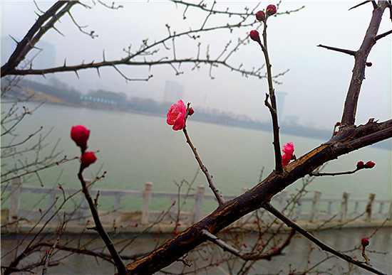 1月25日早晨,我市下了一場小雨。周口公園的梅樹上,幾朵梅花已經(jīng)綻放枝頭,被雨水滋潤過后的梅花嬌艷,凝結(jié)在梅花上的小水珠晶瑩剔透,讓梅花變得別有一番詩意。