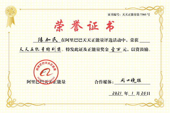 1月26日下午,阿里巴巴天天正能量得知陳加民冰窟救人的事跡后,決定授予陳加民天天正能量特別獎,并頒發(fā)10000元正能量獎金,向他的救人義舉點贊致敬。