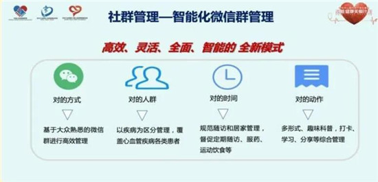健康關(guān)愛群,是一種智能化微信群,利用“互聯(lián)網(wǎng)+技術(shù)”,突破空間限制,多渠道分享專業(yè)的疾病管理知識(shí),鼓勵(lì)患者每日監(jiān)測(cè)體重、血壓、合理健康飲食與運(yùn)動(dòng)、規(guī)律按時(shí)服藥,以提高患者治療過程中的參與度,養(yǎng)成良好的習(xí)慣,全面改善心血管疾病醫(yī)療服務(wù)。