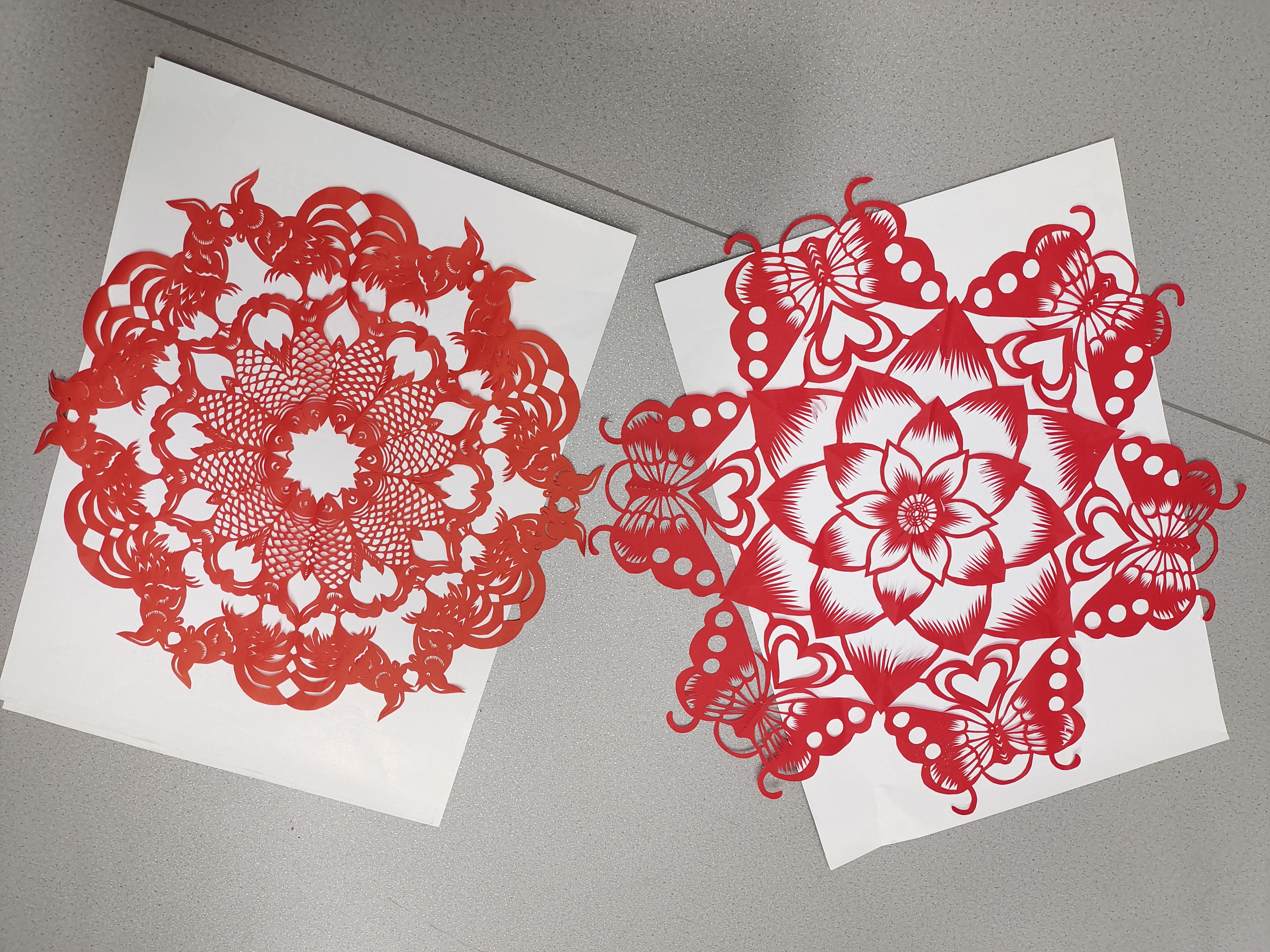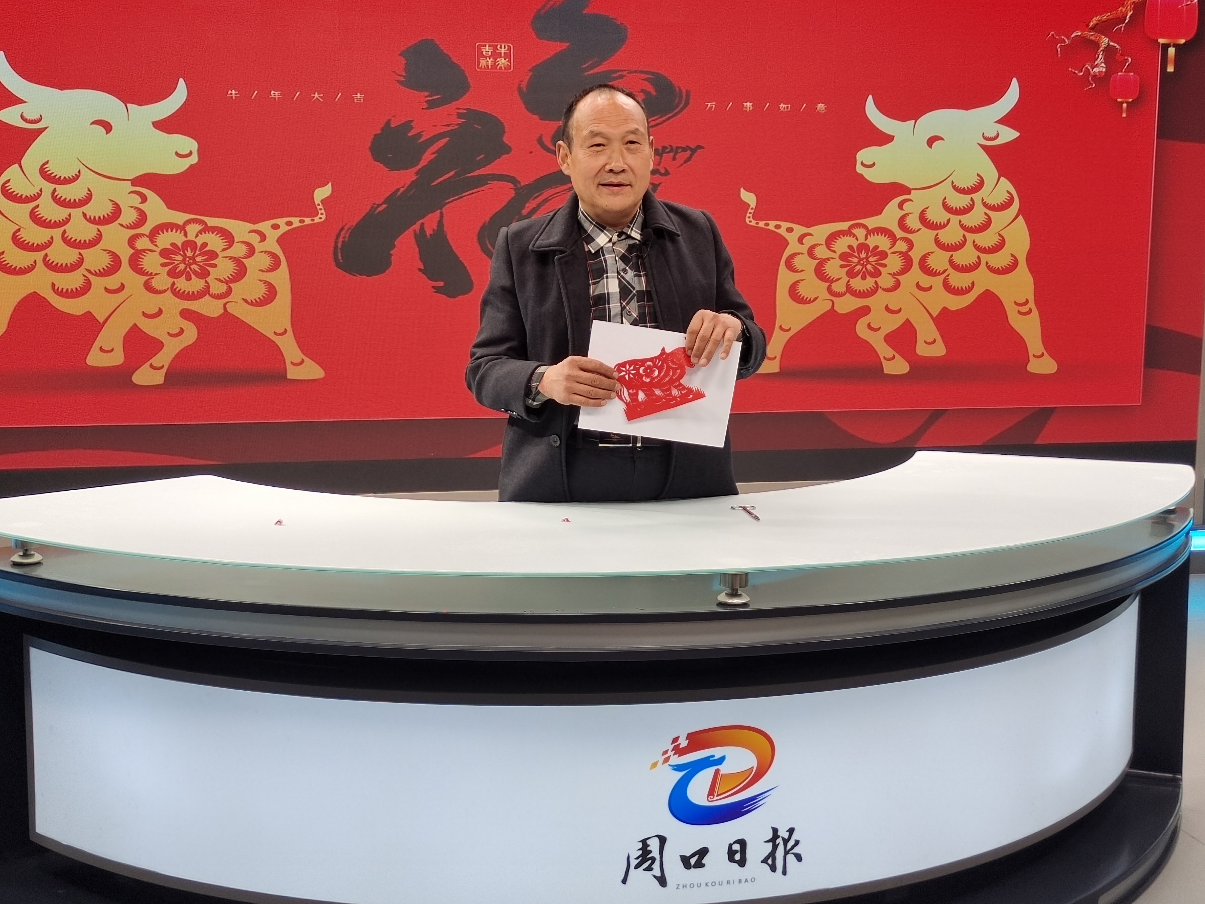 除了“紅雙喜“,王銀生還現(xiàn)場(chǎng)展示了剪窗花,剪蝴蝶,并應(yīng)著即將到來(lái)牛年的景剪了耕牛。只見(jiàn)平平常常的紅紙?jiān)谕蹉y生的手中精準(zhǔn)對(duì)折,上下翻飛,一把銀亮的剪刀“嚓嚓”作響,很快就賦予紅紙“生命”,剪出一個(gè)個(gè)生動(dòng)的造型。展示完畢后記者對(duì)王銀生進(jìn)行采訪,探尋他的剪紙之路。