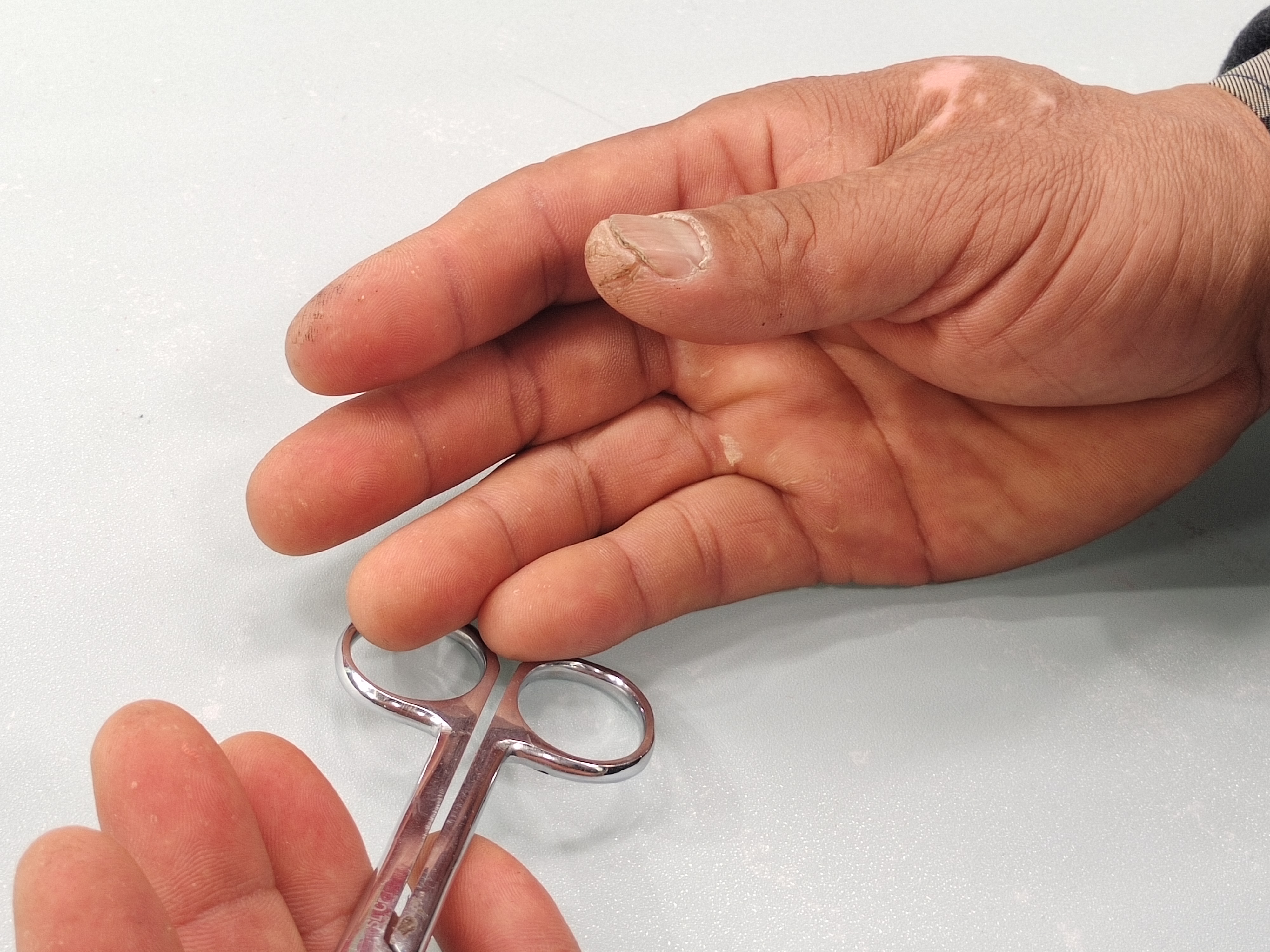 王銀生因長(zhǎng)期剪紙而布滿老繭和傷口的手
