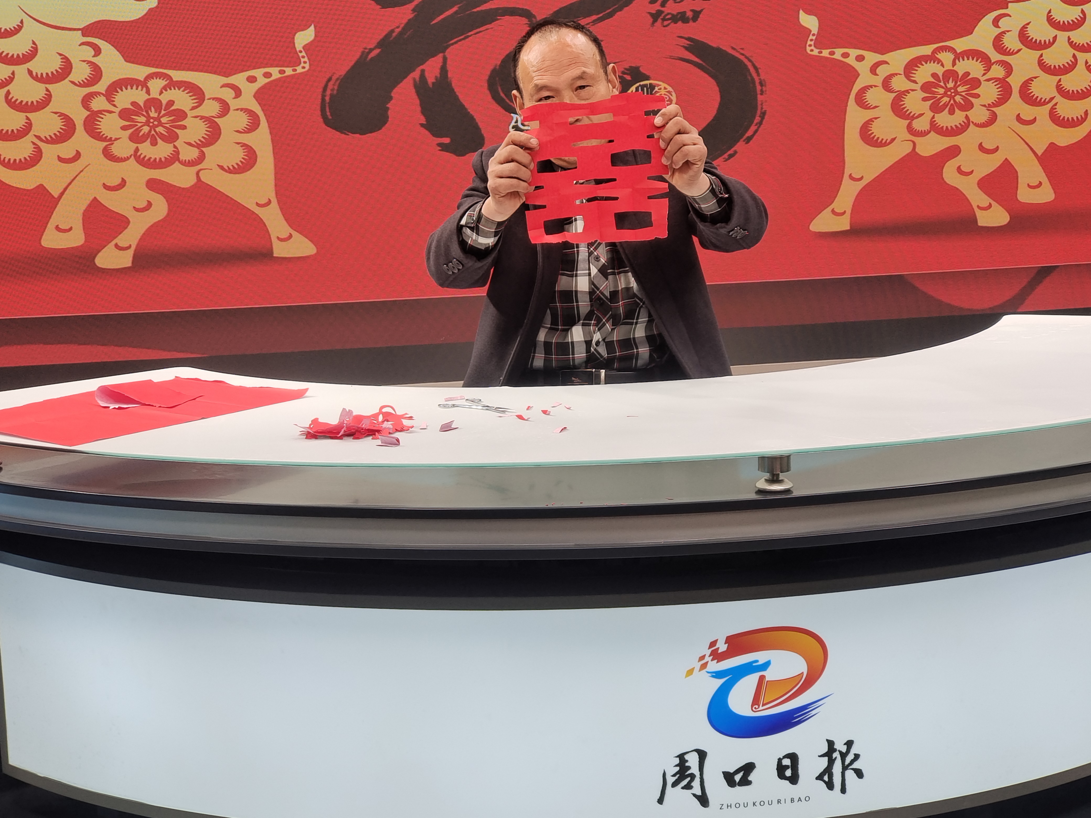 一張正方形紅紙,經(jīng)多次對(duì)折后,兩剪刀,剪出一個(gè)大紅雙“喜”字。1月29日,在周口日?qǐng)?bào)融媒體演播室,河南省民間藝術(shù)學(xué)會(huì)會(huì)員,剪紙藝術(shù)委員會(huì)理事,“非遺”傳承人王銀生亮出“兩剪子剪出一個(gè)紅雙喜”的絕活。