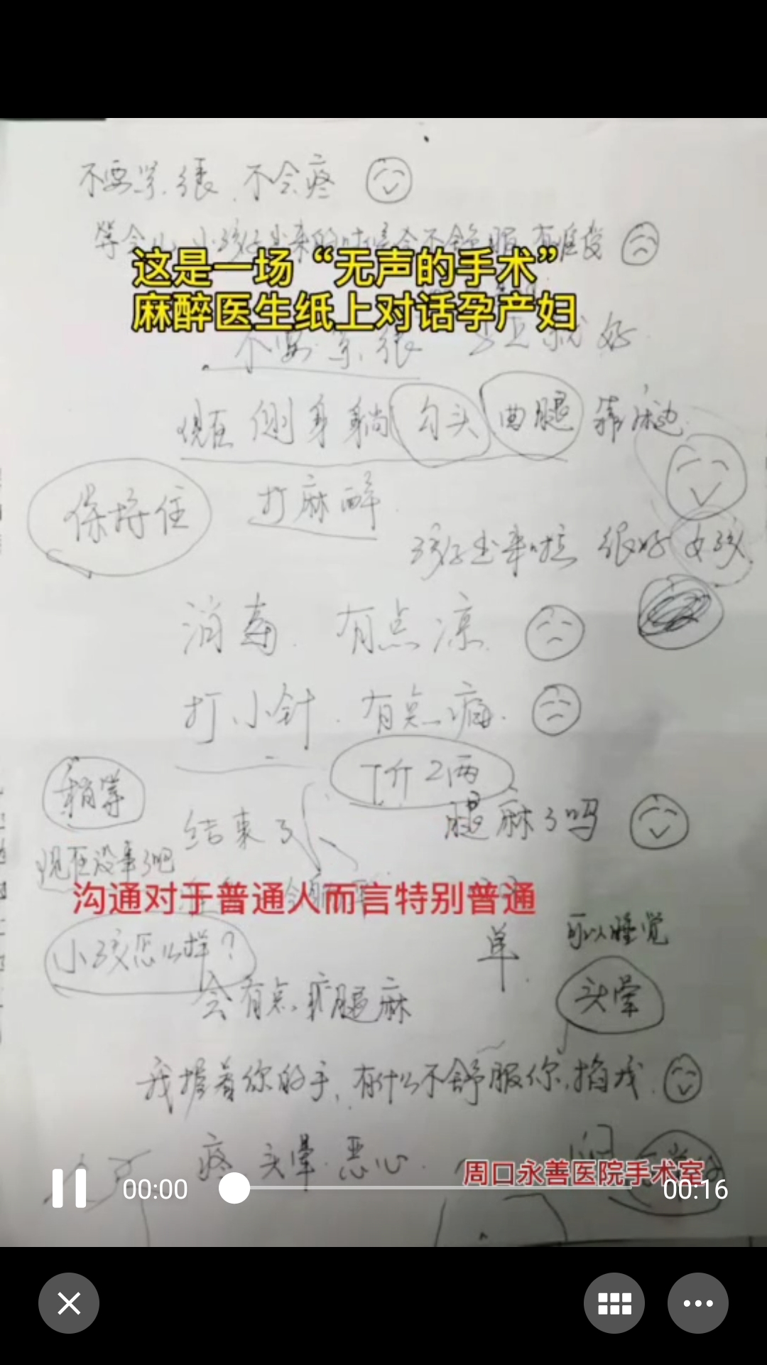 2月1日,記者終于找到小視頻的主角——周口永善醫(yī)院麻醉醫(yī)生張軍杰。他回憶道:“幾天前,我們接診一名產(chǎn)婦,她是一名聾啞教師,有語(yǔ)言障礙。手術(shù)中,為了好溝通,我就找來(lái)一張紙,在紙上一直問(wèn)她‘腿麻了嗎?’我握著你的手,有什么不舒服你掐我’,并鼓勵(lì)她‘不要緊張,不會(huì)疼’‘堅(jiān)持住’,有時(shí),我還在紙上給她畫(huà)些網(wǎng)絡(luò)小表情、萌圖,緩解她緊張的情緒。慢慢,原本心情緊張的她逐漸放松下來(lái)?!?/p>