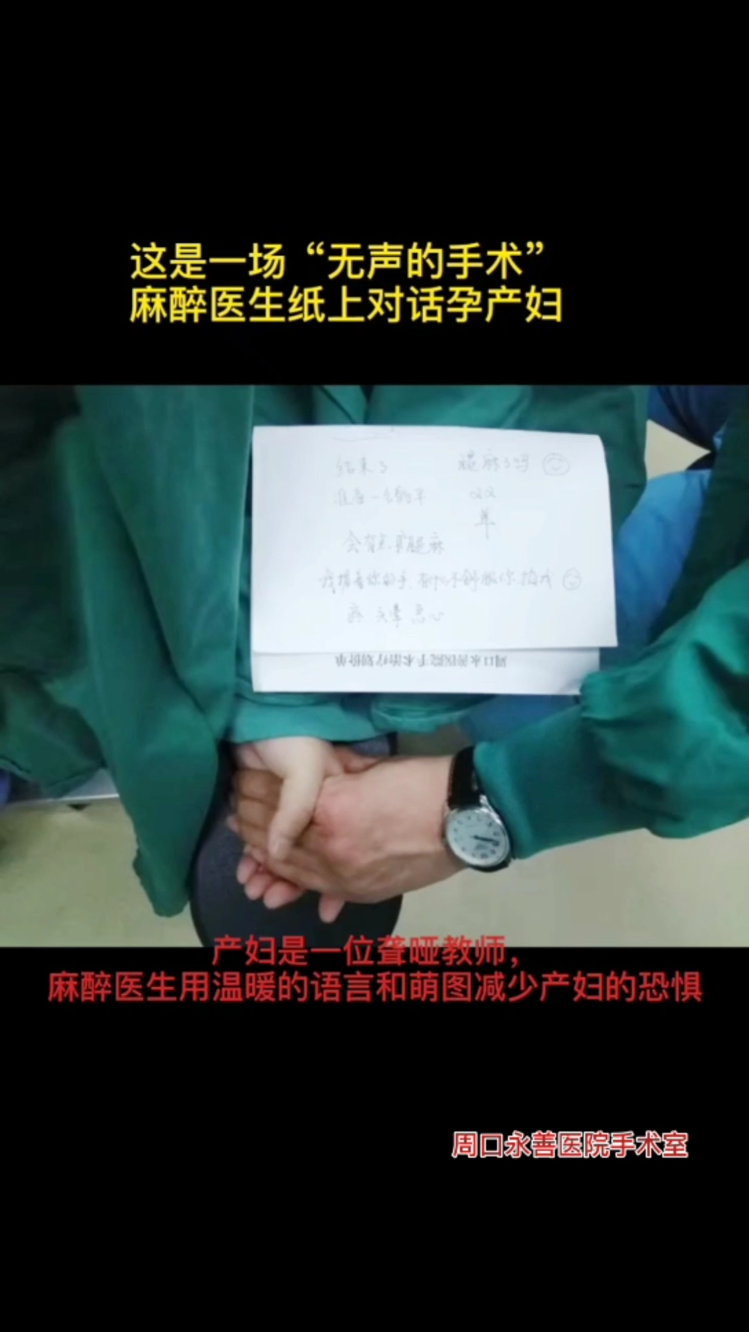 近日,扶溝網(wǎng)友被朋友圈里這一個(gè)小視頻感動(dòng)著:醫(yī)院產(chǎn)房?jī)?nèi),“我握著你的手,有什么不舒服你掐我”類(lèi)似的話寫(xiě)了滿(mǎn)滿(mǎn)一張紙。這是一場(chǎng)“無(wú)聲的手術(shù)”,對(duì)話者是麻醉醫(yī)生和聾啞產(chǎn)婦。網(wǎng)友看到這張紙后制作成小視頻紛紛轉(zhuǎn)發(fā),大愛(ài)感染著整個(gè)城市。