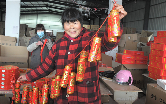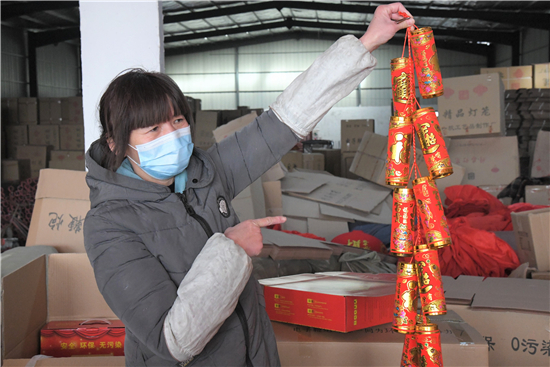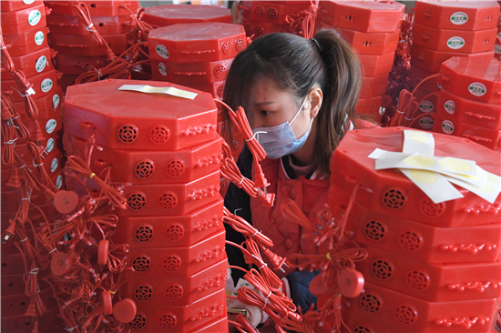 2月2日,在商水縣魏集鎮(zhèn)產(chǎn)業(yè)扶貧基地一帆工藝制作工廠(chǎng),村民正在生產(chǎn)安全、環(huán)保、無(wú)污染的電子鞭炮。春節(jié)臨近,不能燃放傳統(tǒng)鞭炮的市民非常喜歡這種高科技替代產(chǎn)品,產(chǎn)品供不應(yīng)求。③2