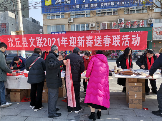 1月30日,沈丘縣文聯(lián)、縣書法家協(xié)會(huì)組織知名書法家10人在縣城新區(qū)開展送春聯(lián)活動(dòng)?,F(xiàn)場(chǎng)為群眾義務(wù)書寫春聯(lián)近千幅,不僅弘揚(yáng)了傳統(tǒng)文化,而且營造了濃郁的節(jié)日氣氛。③6(周口日?qǐng)?bào)·周道客戶端記者 韋偉 通訊員 陳國旗 攝)