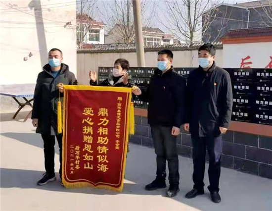 西華縣黃橋鄉(xiāng)個(gè)私協(xié)分會(huì)黨支部書(shū)記、西華縣豫龍食品有限公司負(fù)責(zé)人李會(huì)霞,帶領(lǐng)該公司員工為黃橋鄉(xiāng)敬老院、后石羊村、奉母鎮(zhèn)七里倉(cāng)二村鄉(xiāng)村大食堂免費(fèi)送去米、面、油、豬肉、水餃等慰問(wèn)品。后石羊村黨支部為其送去了“鼎力相助似海深、愛(ài)心捐贈(zèng)恩如山”的錦旗以示感謝。